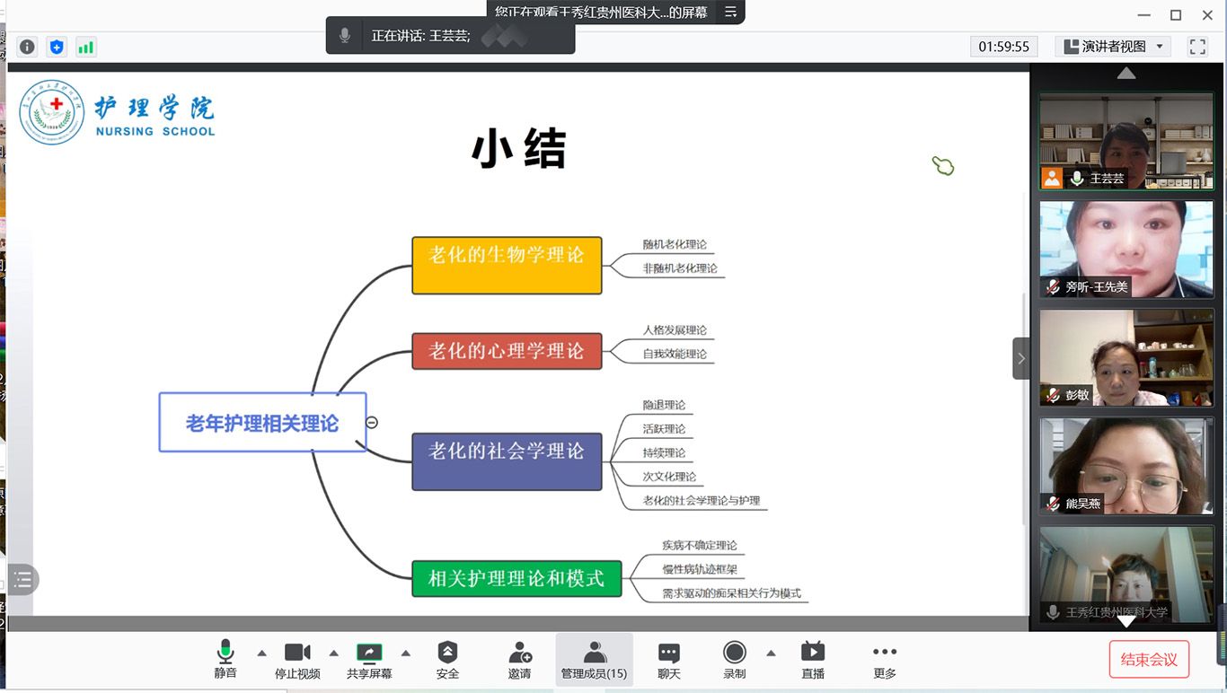 3月3日晚上,《老年护理学》课程团队以腾讯会议方式开展集体备课,与既往不同,今年的老年护理学教学团队事先进行了必要的调整充实,更加体现“护教协同”,将附院老年护理方向硕士生导师加入到教学团队中。当天的活动除授课教师外,附属医院护理部副主任蔡鹏和学院相关教师、老年护理研究生参与了本次活动。活动上首先由《老年护理学》校级“课程思政”建设项目负责人王芸芸介绍了课程概况和课程思政建设的思路。接着老年护理学方向研究生导师、本科老年护理学主讲教师王秀红副教授以说课的方式展示了第一章、第二章课程教学教案和PPT,重点讲授了思政育人元素与目标、时间分配、组织教学的方法等,为后面该课程的教研活动提供了方法指导。参会师生纷纷表示,希望今后多开展此类教研活动,提升学院教师的临床思维,提高临床教师教学能力,促进优势互补,从根本上提升护理人才培养的质量。
